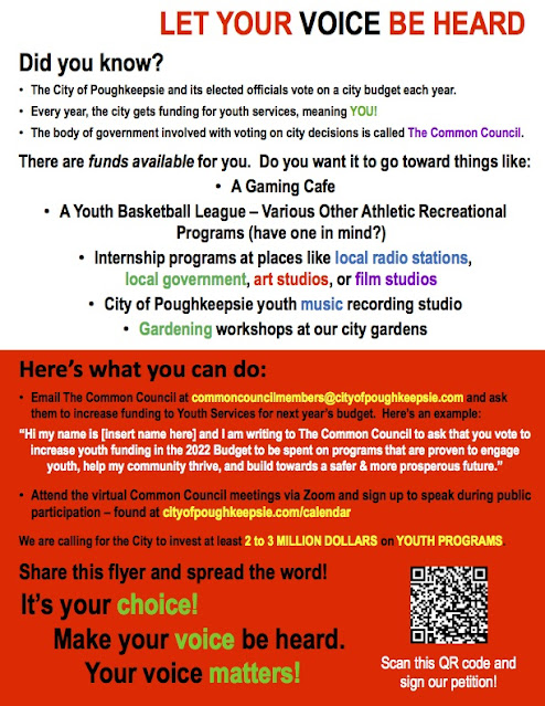 - Write the common council (CommonCouncilMembers@cityofpoughkeepsie.com) and mayor (mayor@cityofpoughkeepsie.com) to demand that they drastically increase the amount we invest in our youth from less than 0.5% to 2%-3% or $2-$3 million dollars. If you have questions about what to write, you can use the petition as a guide or reply to this email for suggestions;